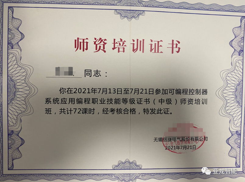 通过培训且考核合格的学员,颁发结业证书及可编程控制器系统应用编程职业技能等级证书(中级)。